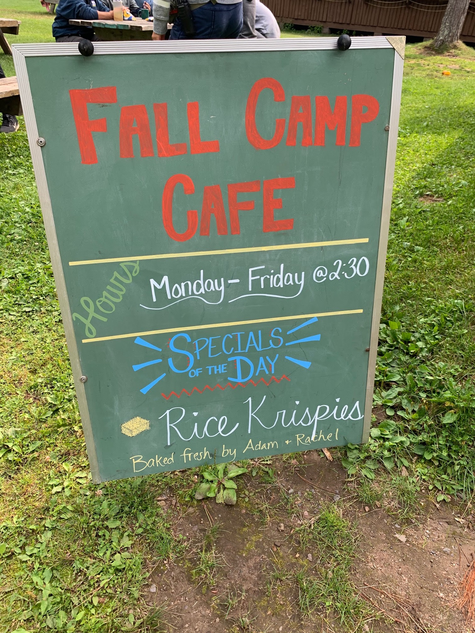 At 2:30 PM today, we rang the bell to officially open the Fall Camp Cafe for the first time ever. The Fall Camp Cafe will give the campers a chance to take a break towards the end of their school day and grab a snack. It will be open every Monday through Friday at 2:30 PM (and closed on weekends — aka camp days!). There was quite a selection of snacks to choose from today: bags of pretzels, popcorn, cookies, string cheese, and some homemade Rice Krispies treats. And since it was a perfect fall day today, we also had some hot chocolate for those with an even bigger sweet tooth. Everyone at the Fall Camp Cafe could relax at the picnic tables with their friends, fill out a First Day Chalkboard to get their picture taken, or listen to the tunes being played on guitar by one of our awesome counselors, David.