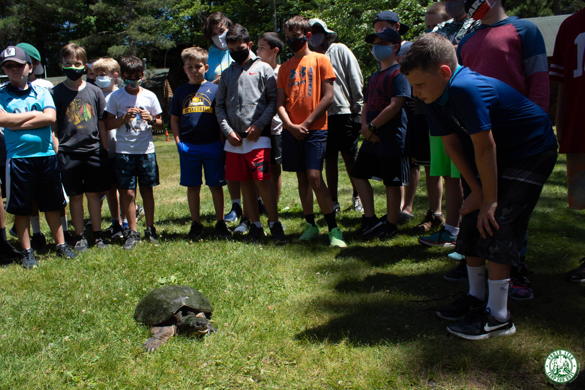 Perhaps the most thrilling moments of the day, however, happened right in front of the Lodge after lunch. A snapping turtle ambled through camp to stir up some fanfare. The turtle, affectionately named Titanium, was escorted to North Lake a few miles from camp.