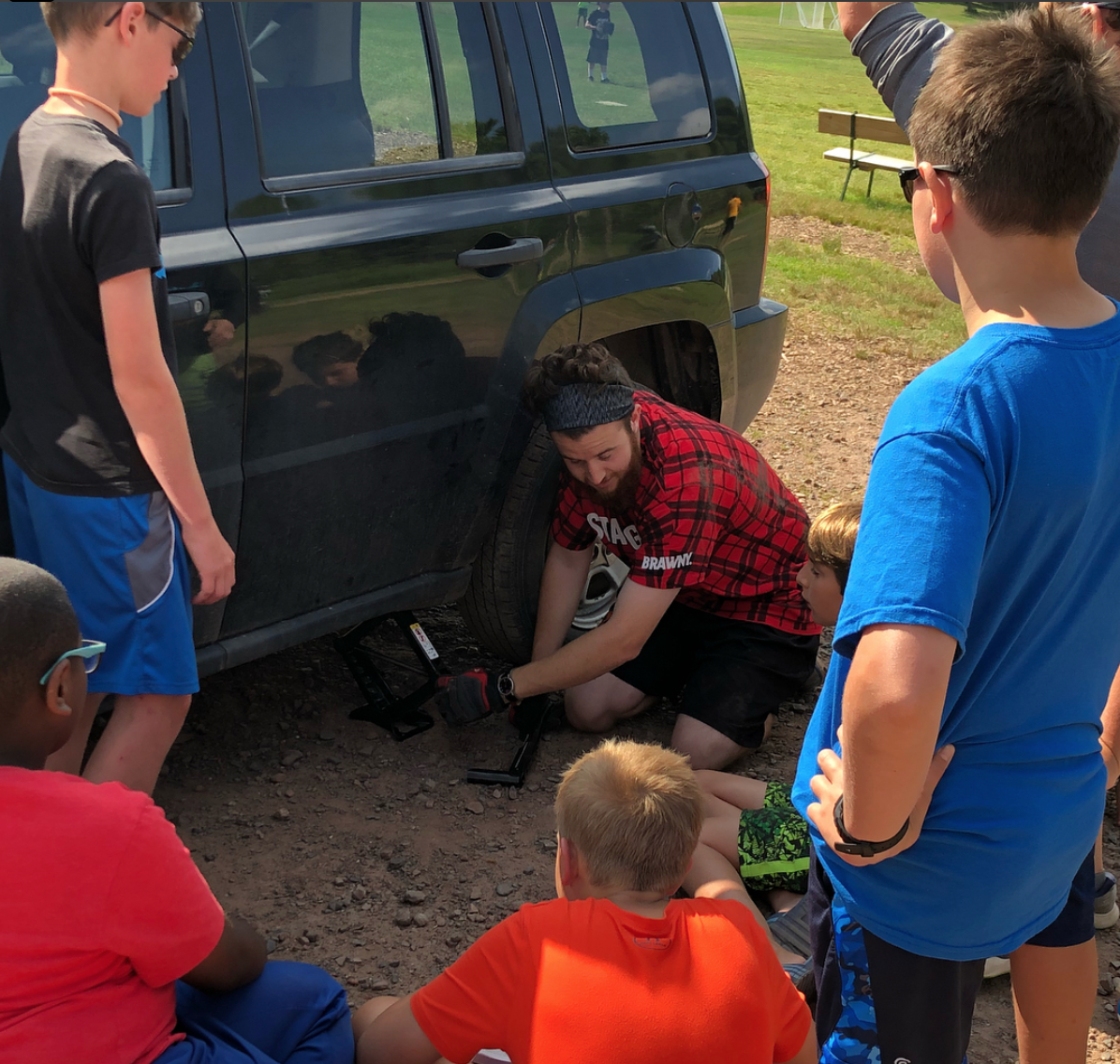 While the schedule on cruiser day is different than others, campers have gotten to experience a variety of unique events and special programs during the session. On Wednesday evening, campers and staff played a game of glow in the dark ultimate frisbee, with a glowing frisbee and each player wearing multiple glow sticks. At Saturday’s dinner picnic, a group of staff members and campers decided to see how tall they could stack their cups, ending with an astounding 101 cups stacked on top of each other! This inspired a cup stacking session in the next day’s Wacky One Day activity. Also featured in Sunday’s Wacky One Day period was Sumo Wrestling, a juggling class, and a seminar on how to change a tire. Campers were given a comprehensive lesson in this important life skill, starting with where to find the manual, and then watching a demonstration on how to change a tire, step by step. Initially attended primarily by our younger boys, a crowd of older campers joined once they saw just how educational the session was.